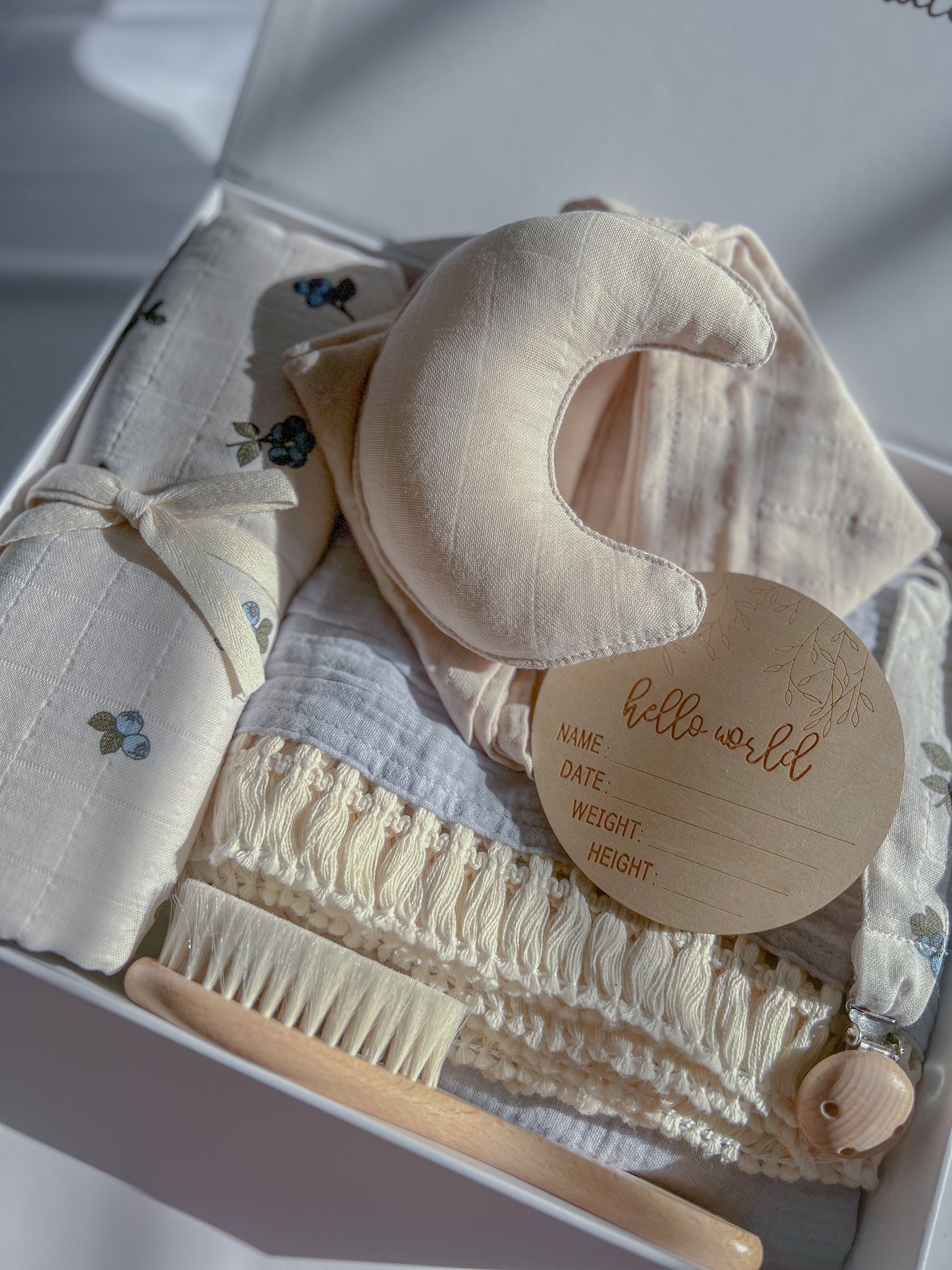 Inside, you’ll find a breathable muslin swaddle delicately printed with blueberry florals, ideal for wrapping, feeding, or cuddle time. A soothing moon-shaped pillow offers comfort and style, while the handwoven tassel blanket brings a touch of luxury to nursery or stroller outings. For everyday care, the set includes a premium wooden hairbrush with ultra-soft bristles and a matching pacifier clip in blueberry print. Completing the collection is a “Hello World” milestone plaque, perfect for capturing baby’s first details.