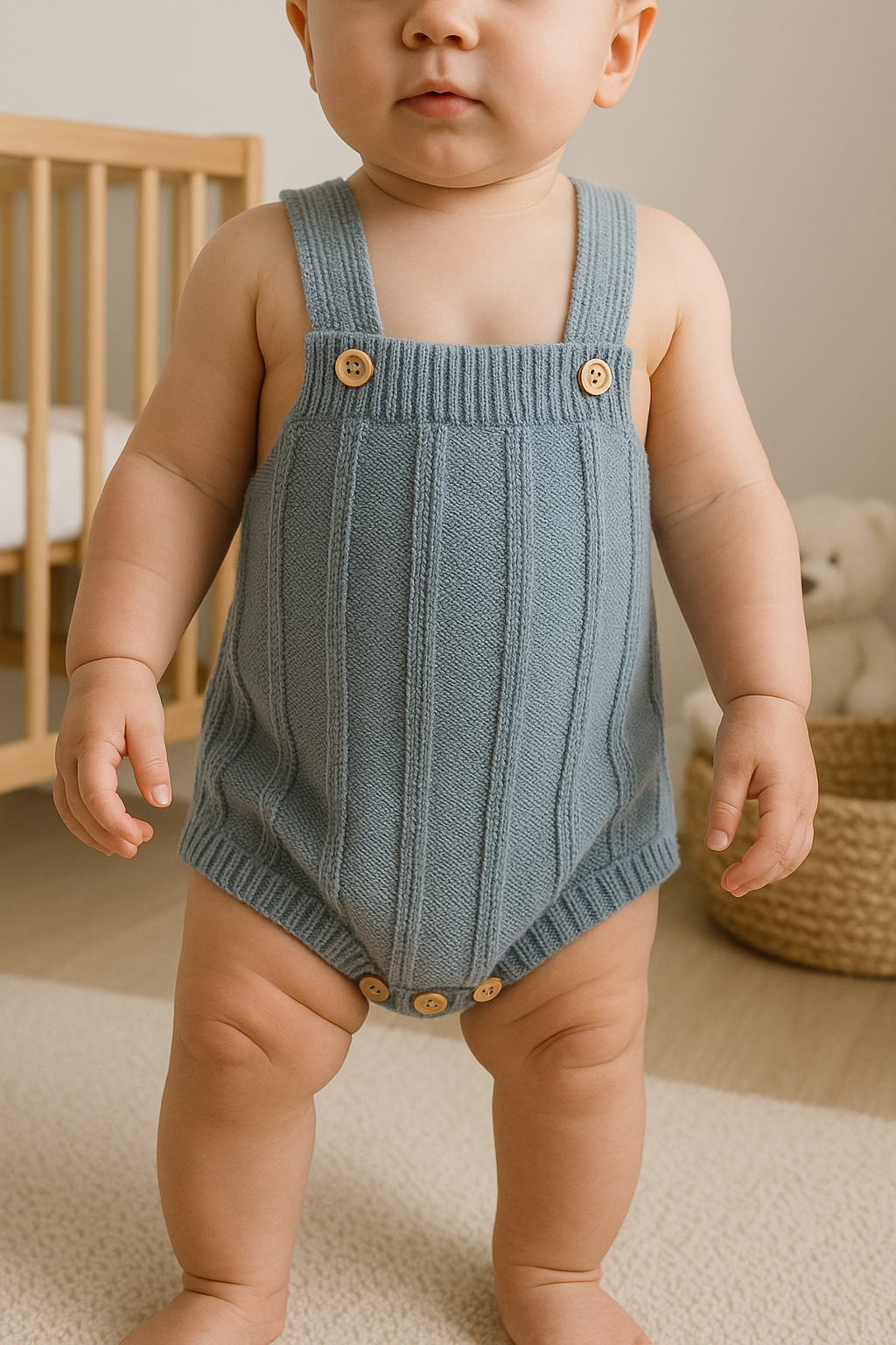Introducing the epitome of timeless elegance for little ones. Crafted from luxuriously soft 100% cotton knit, this minimalist blue romper exudes simplicity and style. Thoughtfully designed with delicate knitted ribbed design around the legs and a matching trim along the neckline and shoulder straps, it’s the perfect blend of subtle charm and effortless sophistication.