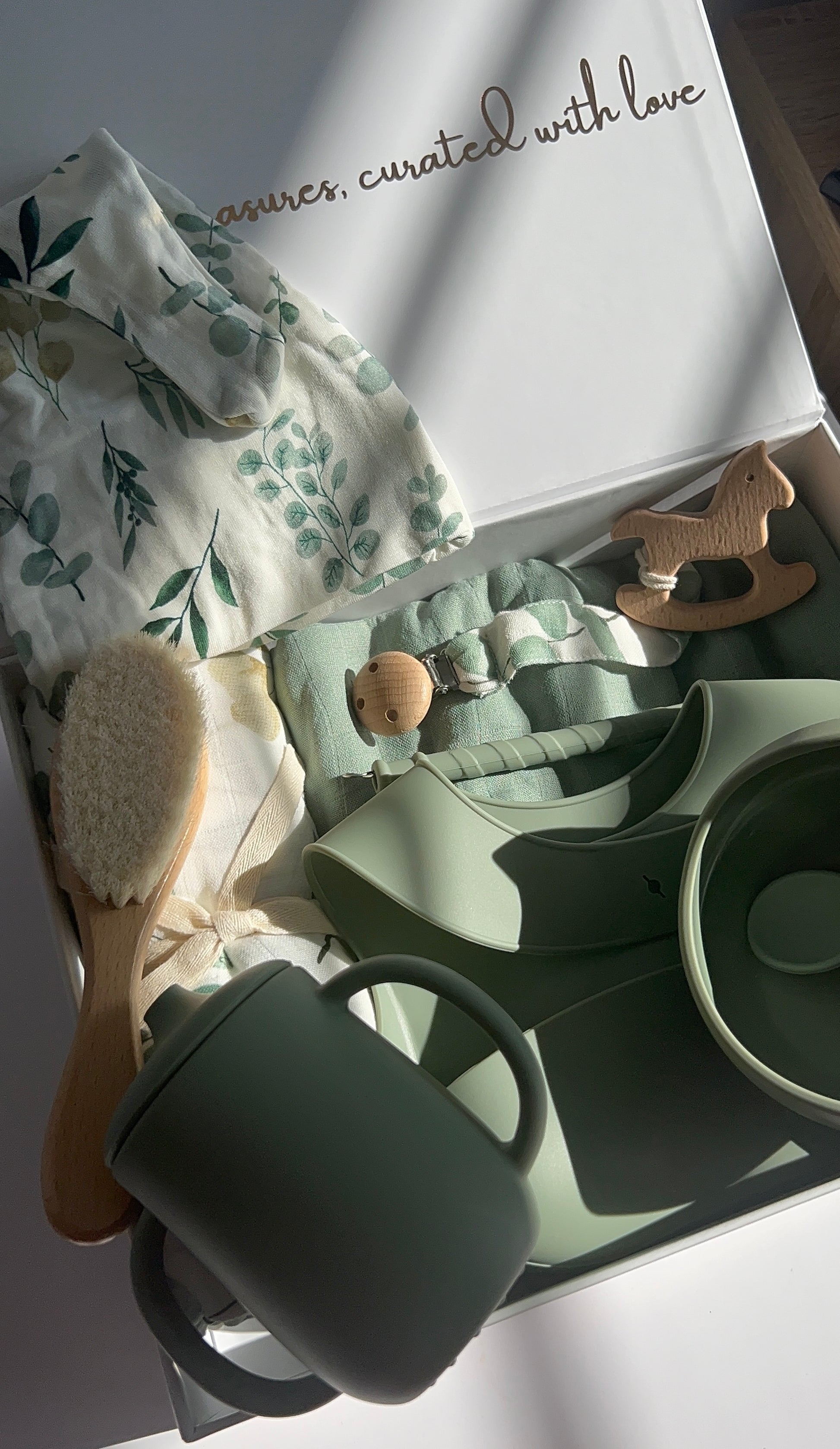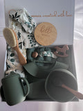 Inside, you’ll find a soft muslin swaddle and matching baby beanie, both adorned with delicate eucalyptus prints. A premium wooden hairbrush with ultra-soft bristles ensures gentle care, while a natural pacifier clip and wooden teether add functional charm. The set also includes a BPA-free silicone feeding bowl and spoon, thoughtfully paired with a sippy cup and placemat for mealtime ease. Completing the collection is a “Hello World” milestone plaque, perfect for capturing those first treasured photos.