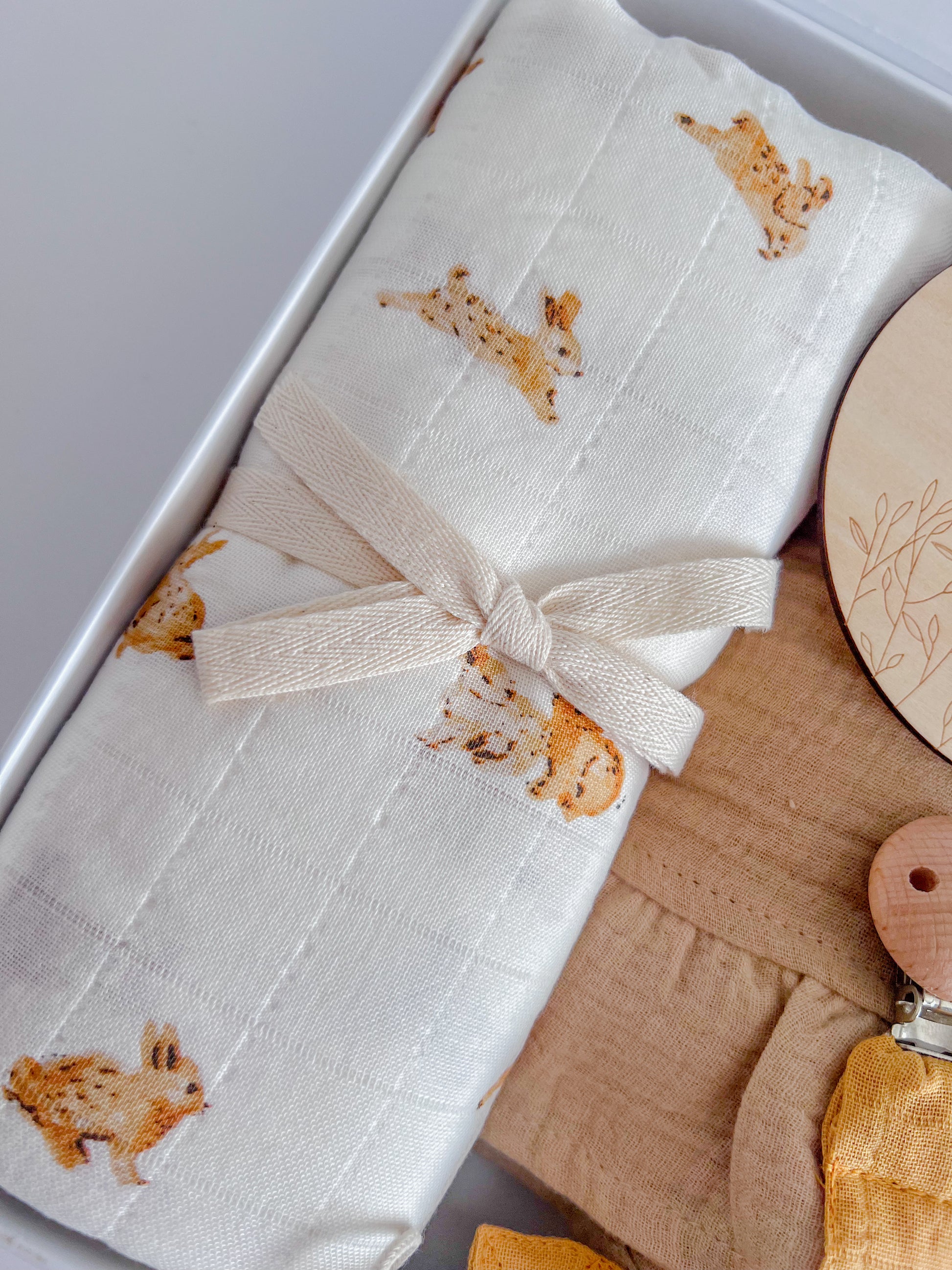 Hop into the joy of new beginnings with the Hopping Bunny Gift Box – a beautifully curated luxury baby hamper designed to delight both parents and little ones. With its warm earthy tones, handcrafted details, and timeless essentials, this box is the perfect baby shower gift, hospital present, or newborn keepsake.